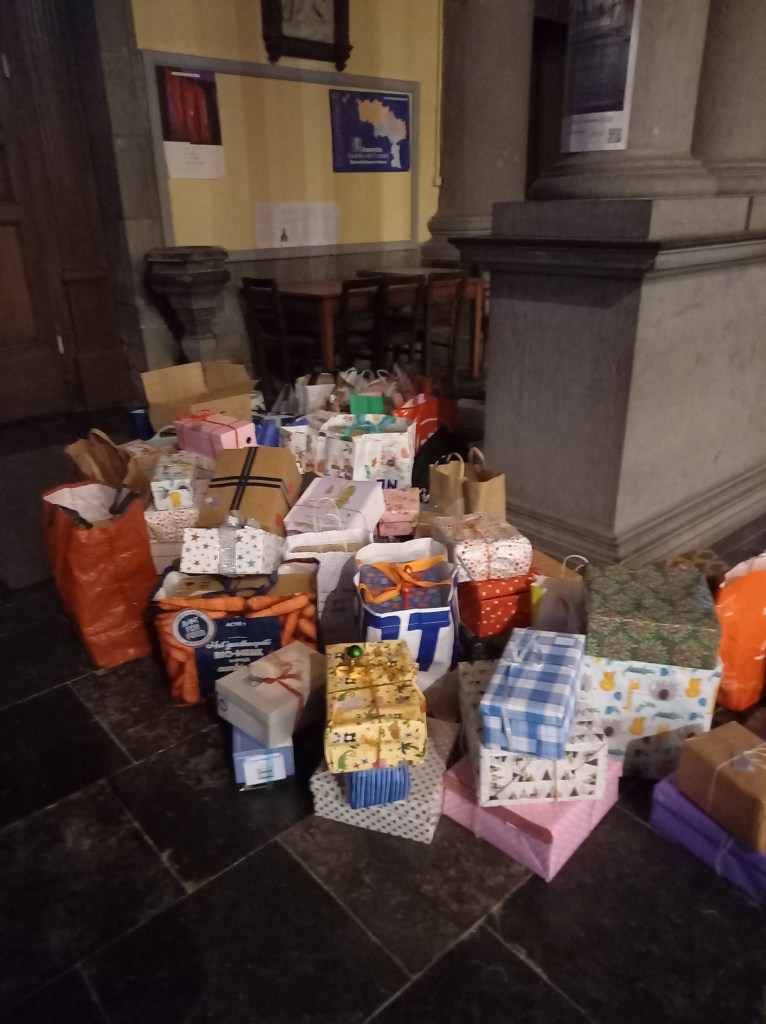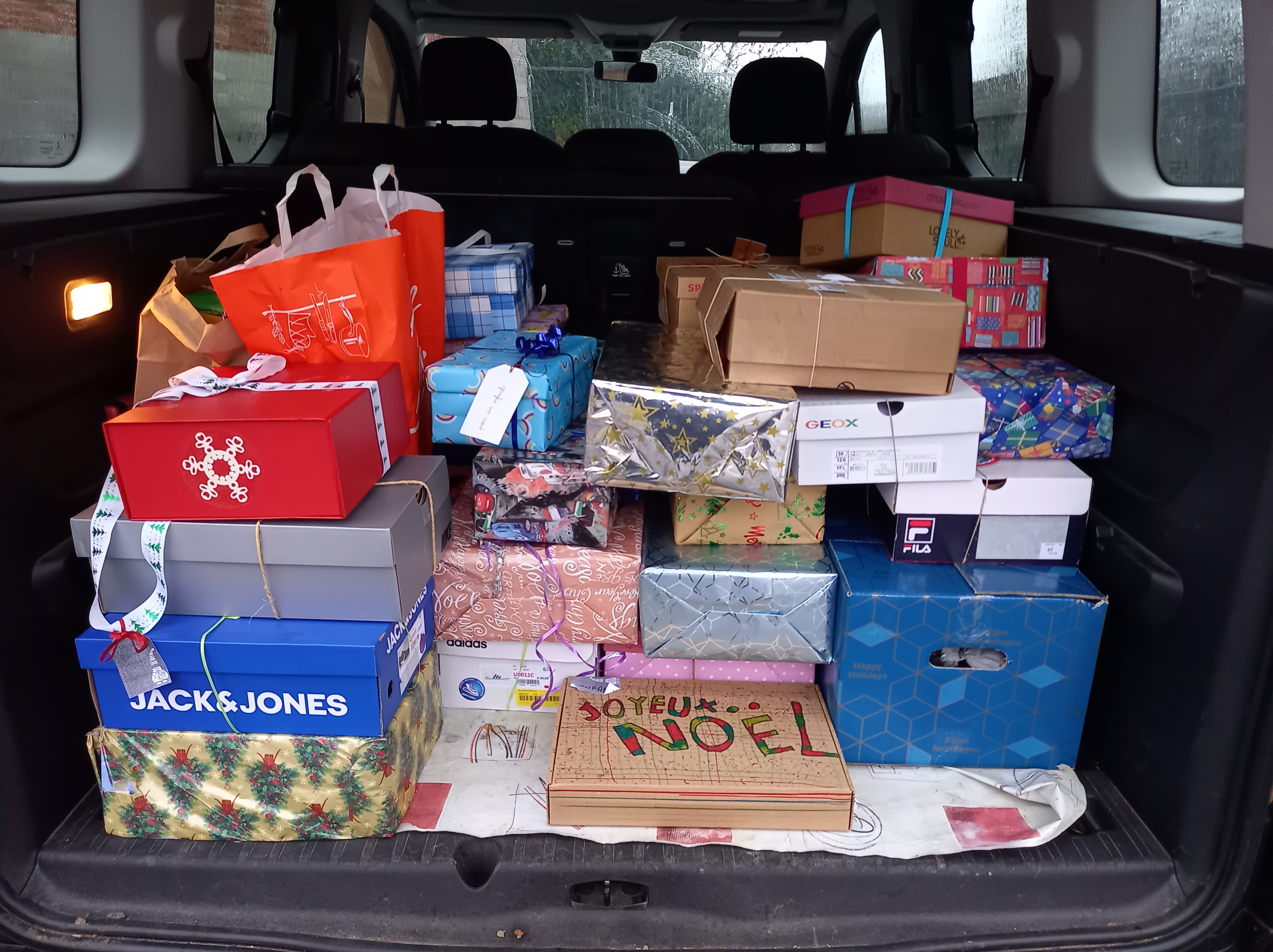 De nombreuses boîtes solidaires remplies de petits présents ( vêtements, nourriture,…) pour aider les