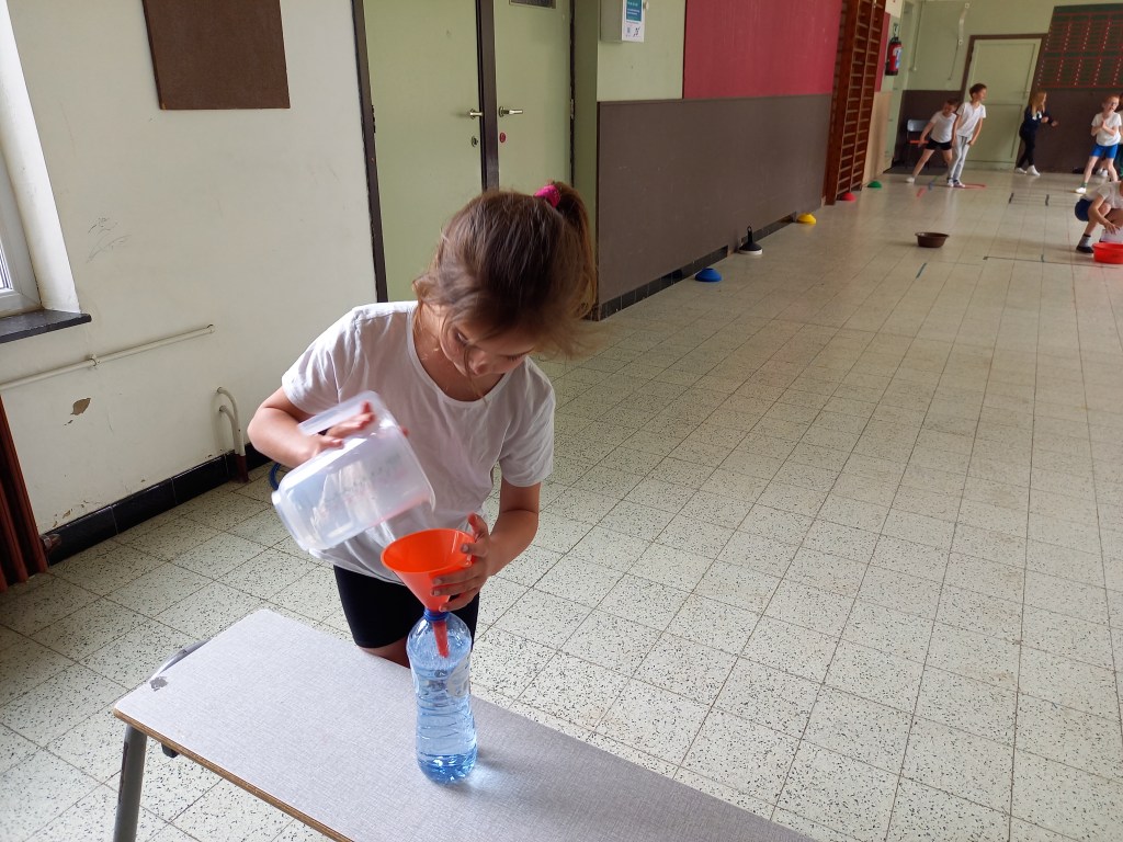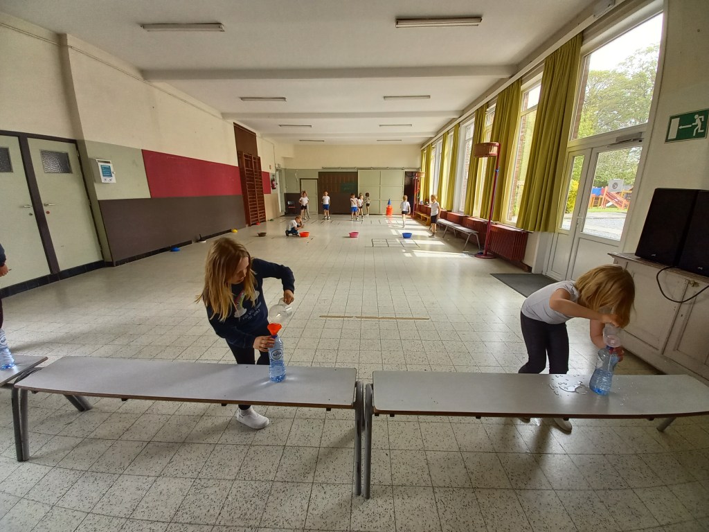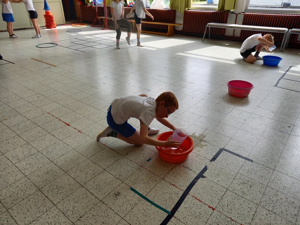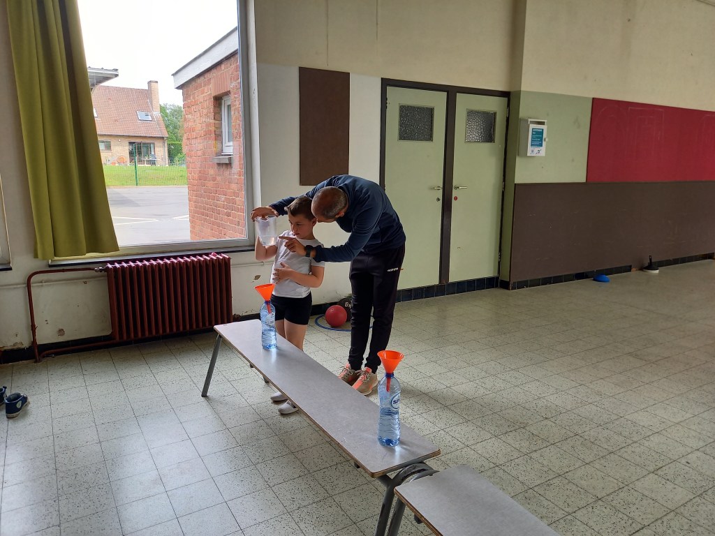 Découverte du litre et de l’utilisation d’un pot gradué durant le cours de gymnastique avec Monsieur Maxime.