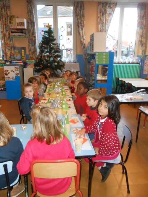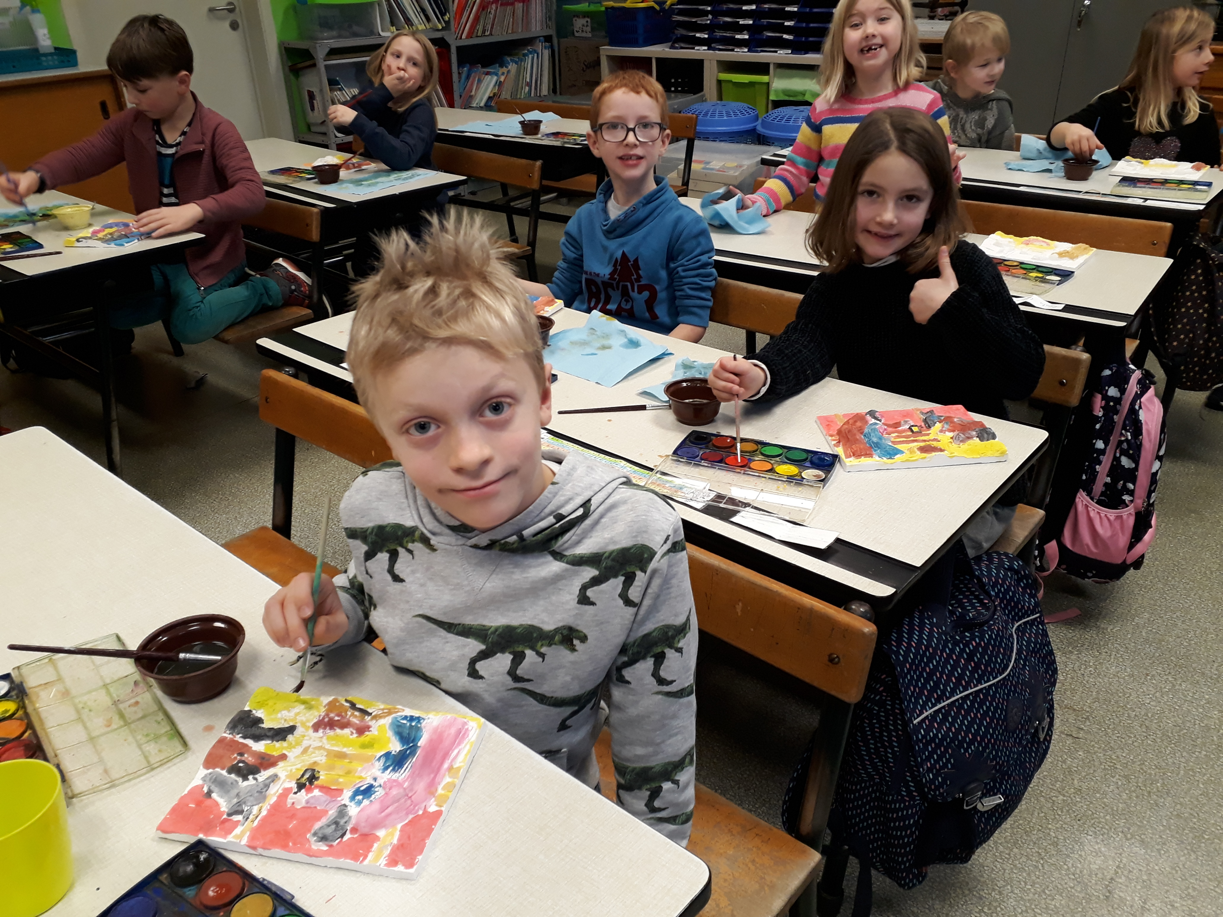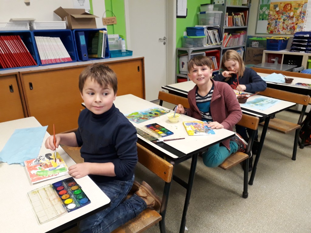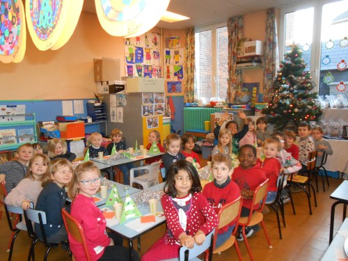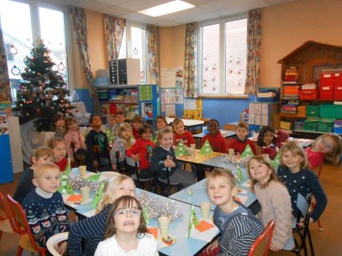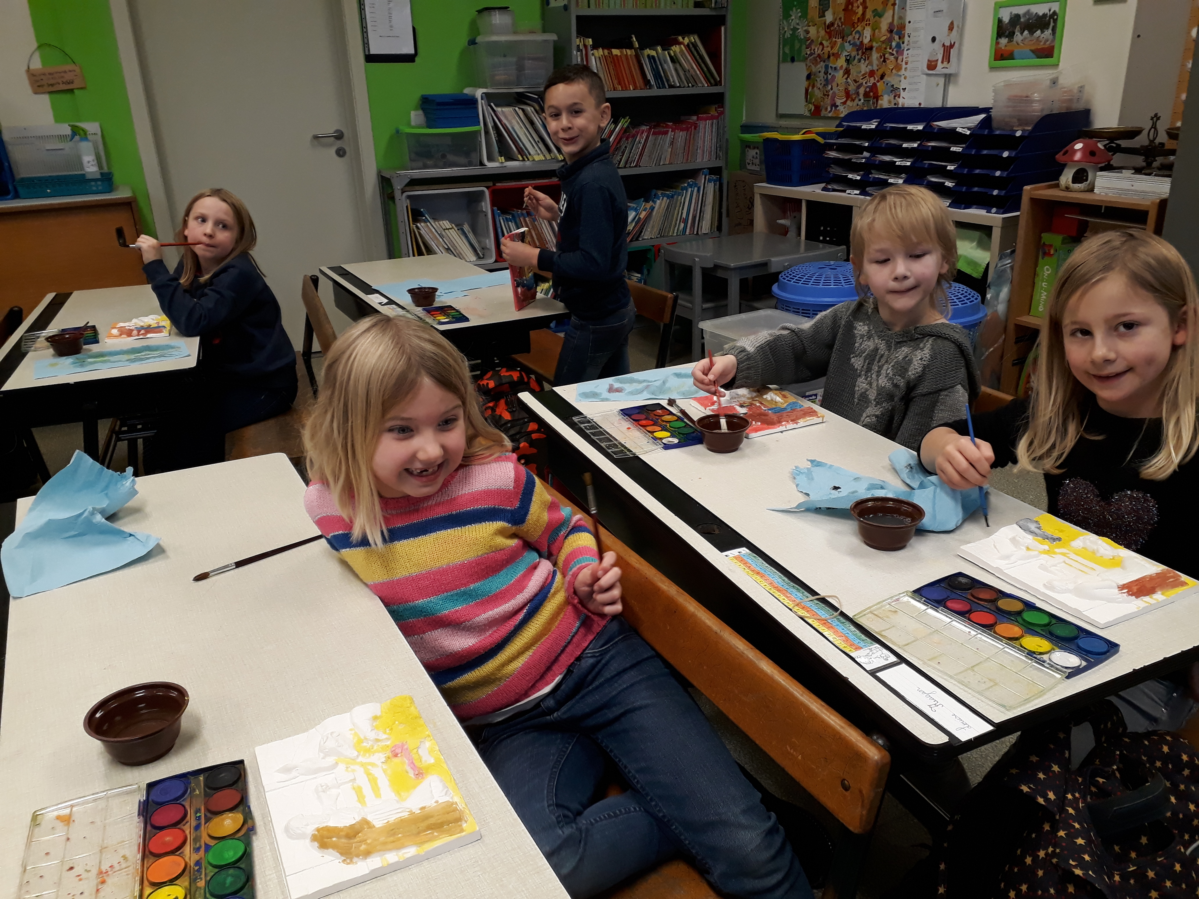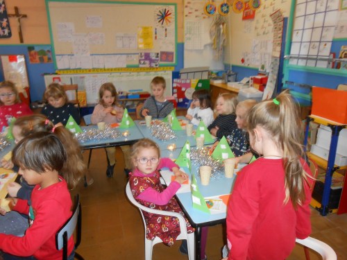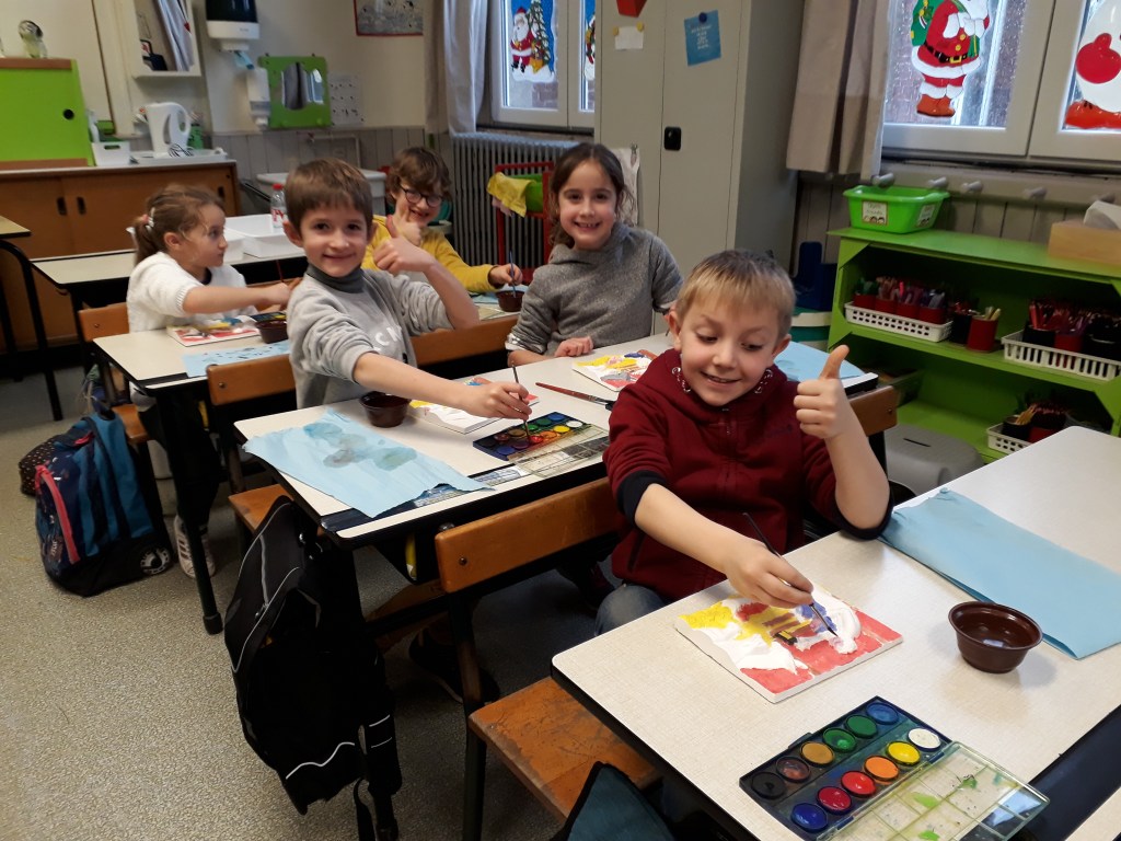 Les petits peintres de 2ème A s’appliquent pour peindre leur crèche de Noël.